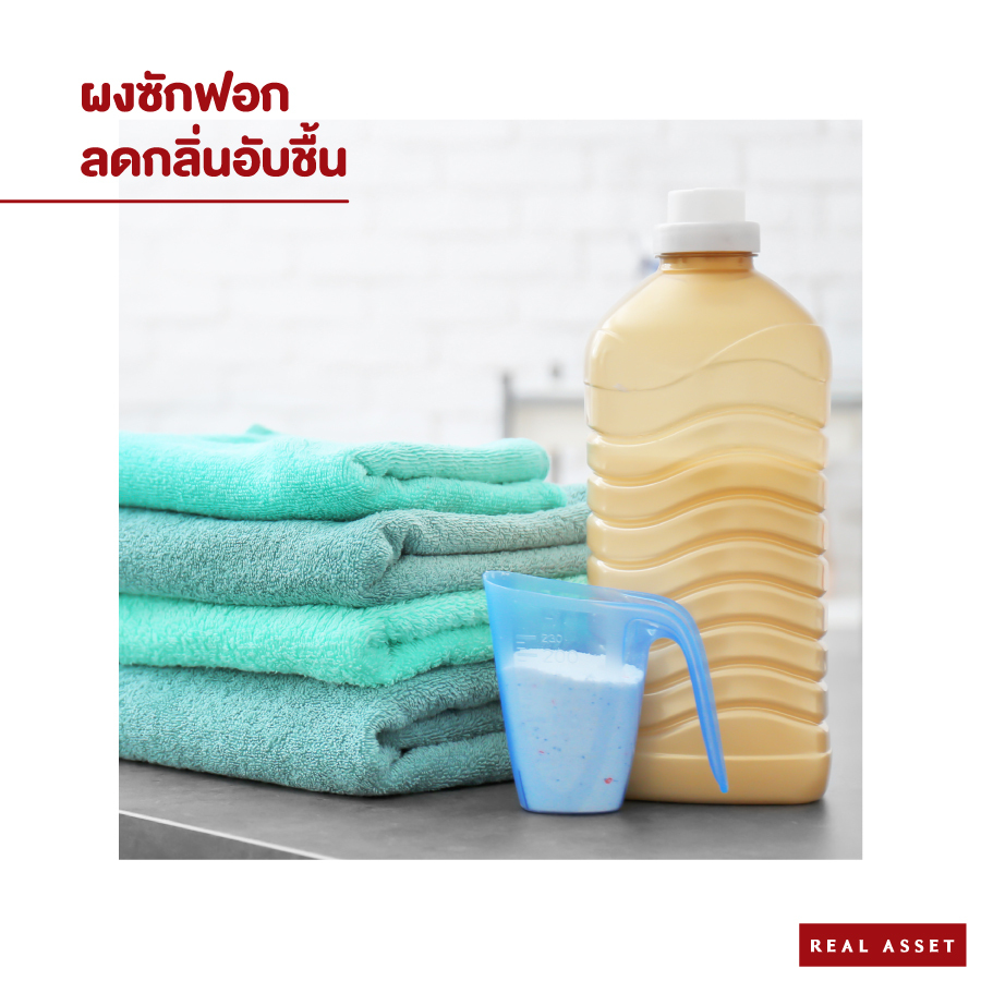 4. ใช้ผงซักฟอก และน้ำยาปรับผ้านุ่มที่มีสูตรช่วยลดกลิ่นอับชื้น