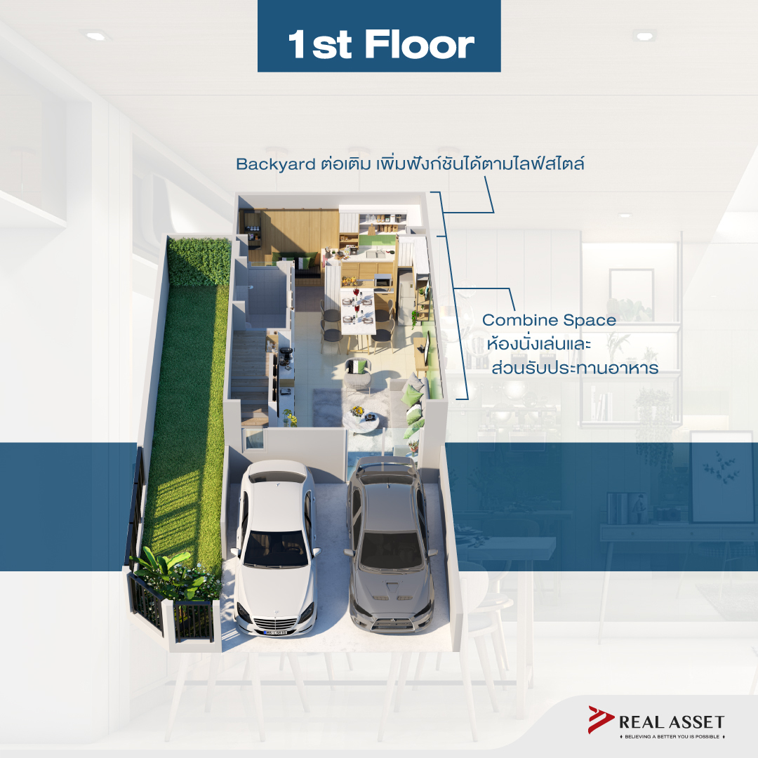 ภายในชั้น 1 จะเป็นพื้นที่ใช้สอยรูปแบบ Combine Space กว้างโล่ง ประกอบด้วยห้องนั่งเล่นและส่วนรับประทานอาหาร เชื่อมต่อกับโถงบันได ห้องเก็บของใต้บันได และห้องน้ำ โดยโซนท้ายสุดจะเป็น Backyard ที่ต่อเติมเพิ่มฟังก์ชันได้ตามไลฟ์สไตล์ เช่น ห้องครัว หรือพื้นที่นั่งเล่นชิล ๆ