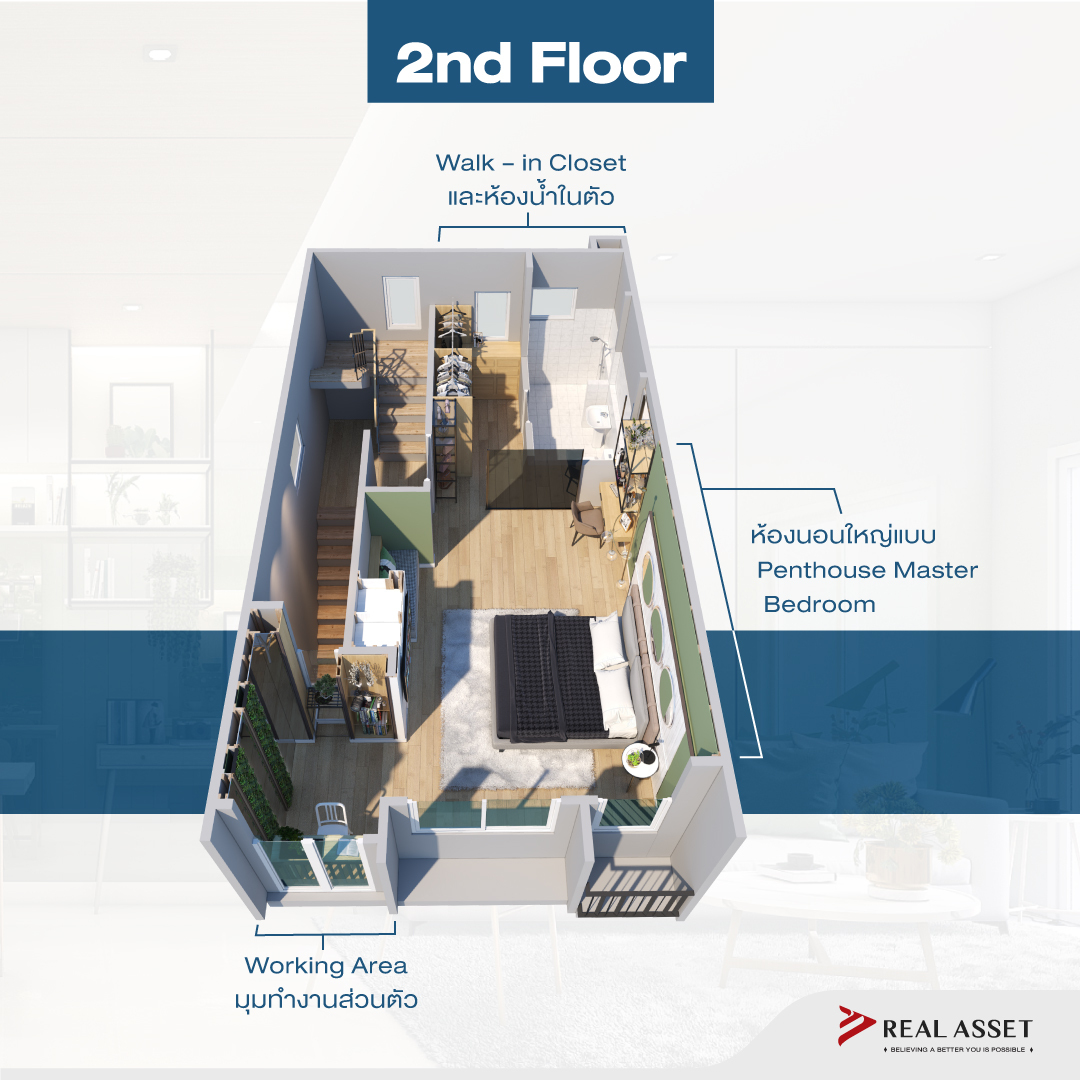 ห้องนอนใหญ่แบบ Penthouse Master Bedroom มีพื้นที่ใช้สอยขนาดใหญ่เต็มทั้งชั้น โดยมีมุมอเนกประสงค์ด้านหน้าบ้าน รองรับการเป็น Working Area และยังมีโซน Walk – in Closet เชื่อมต่อกับห้องน้ำในตัว ใช้งานสะดวก